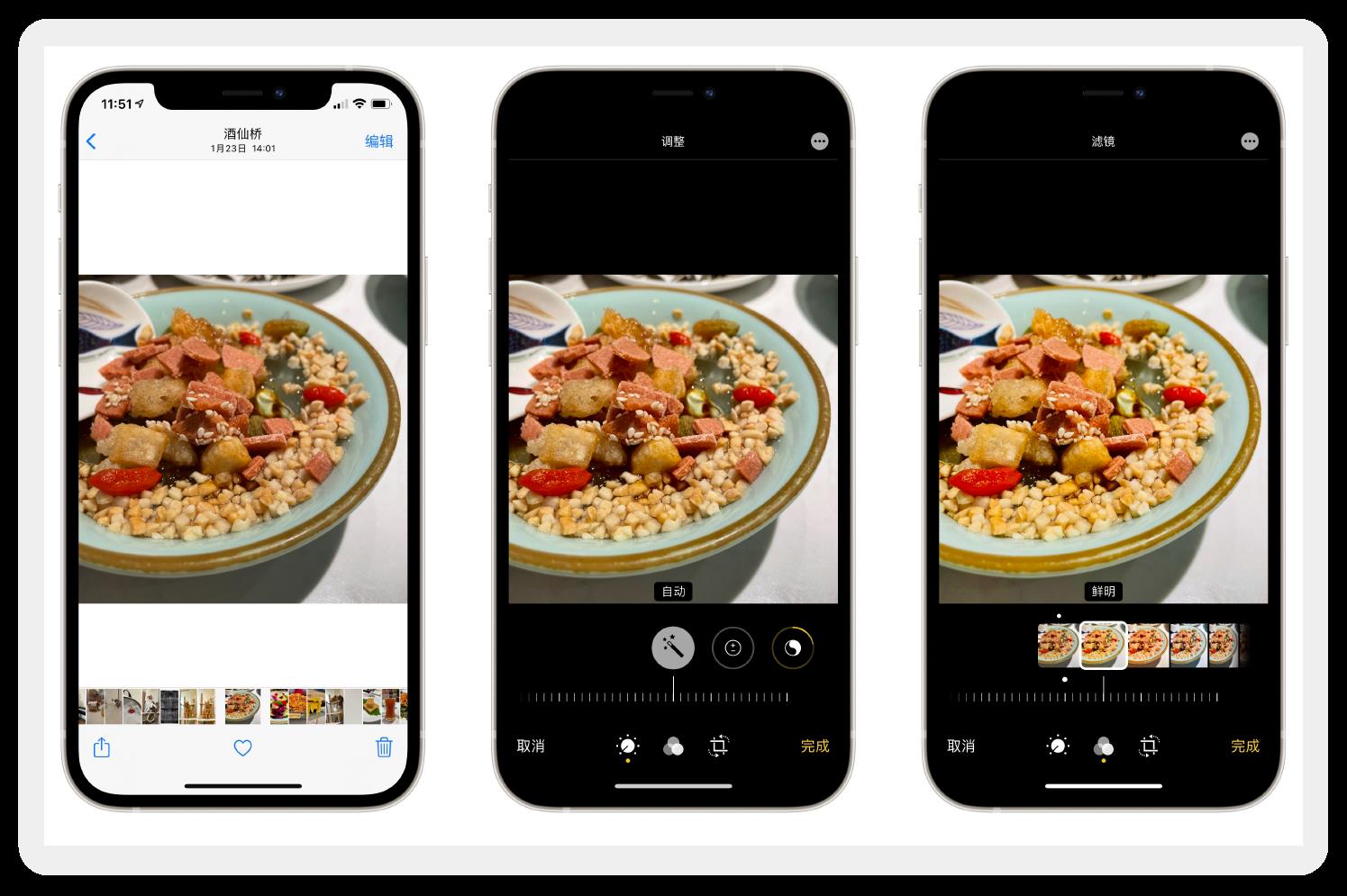 如果你有更高阶的需求,可以尝试其他自带滤镜,或者用自带工具调节亮度、锐度、对比度、色温等等一系列参数。所有的修图过程系统都会记录,一键即可还原为原始照片。