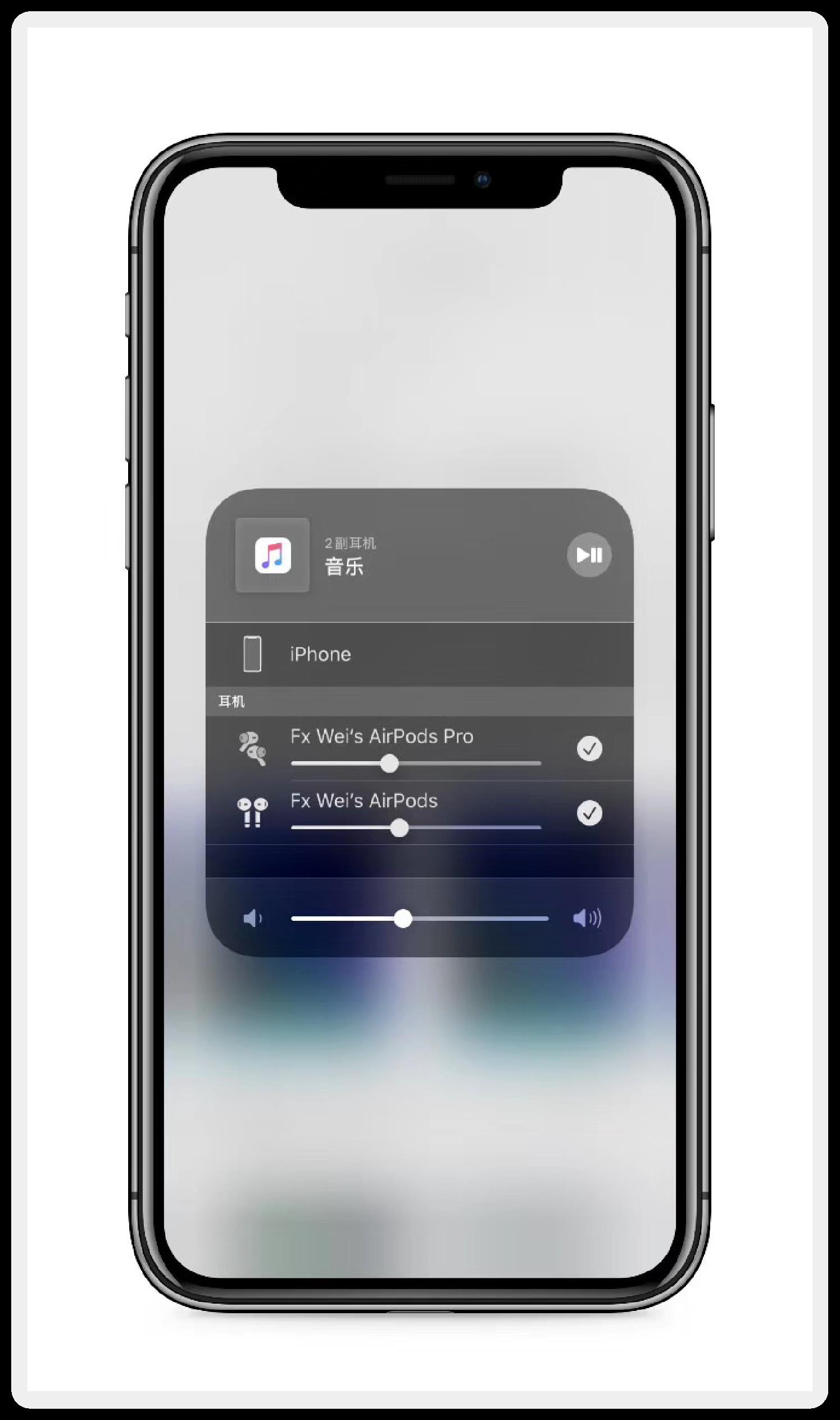 在 iPhone 连接一个 AirPods 后,将另一个 AirPods 靠近此 iPhone 并打开充电盒,手机会自动跳出连接菜单,选择“暂时共享音频”即可。
