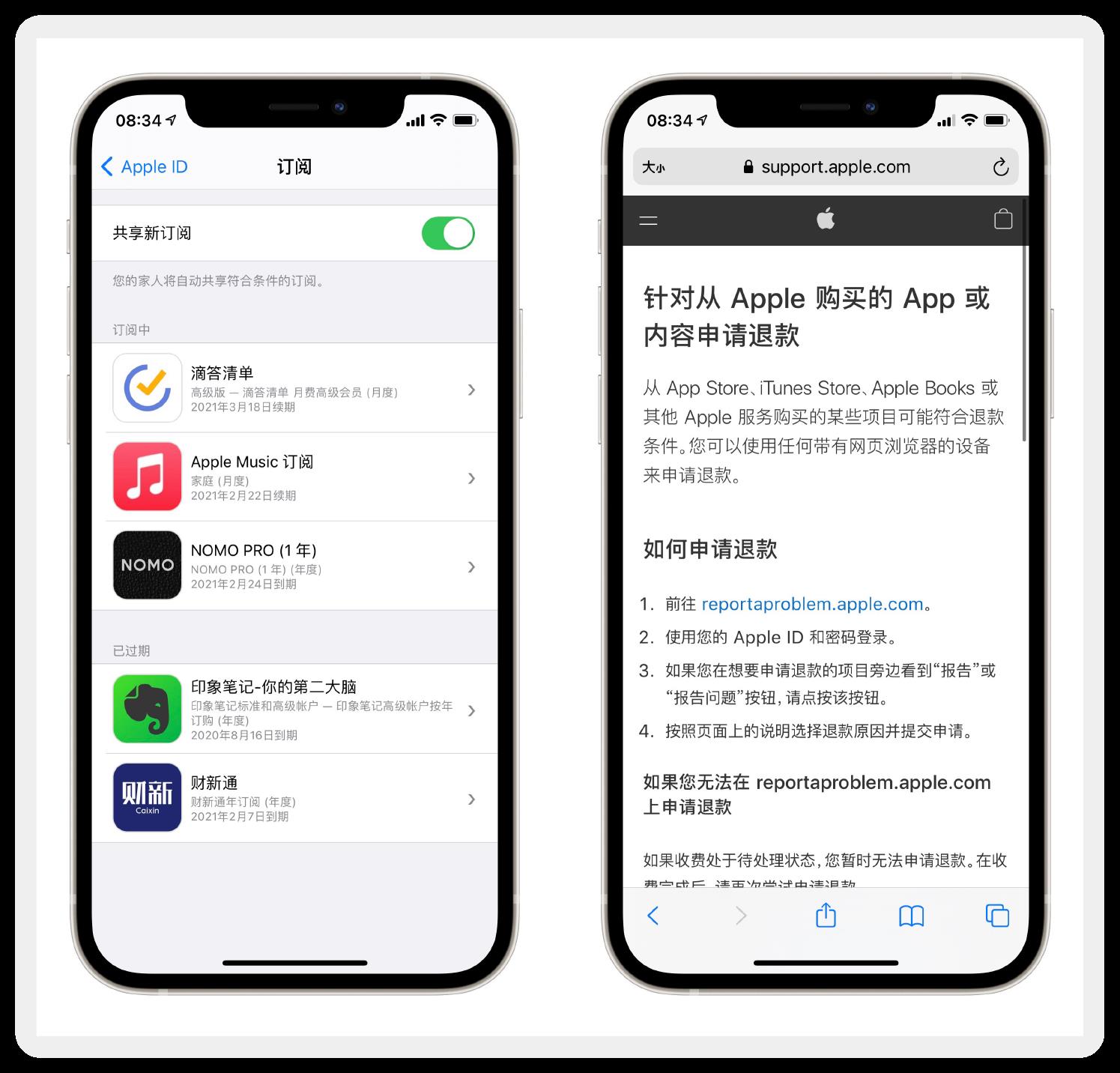 在“设置-头像-订阅”中,可以管理自己订阅的付费内容。被扣费了也不用担心,登录苹果官网 reportaproblem.apple.com 或直接拨打 400-666-8800 都可以申请退款。