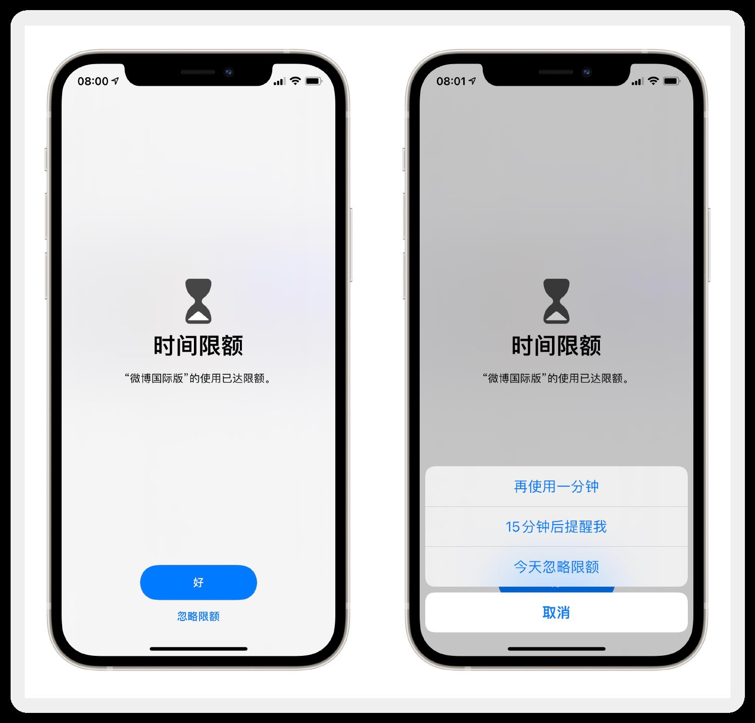 在“设置-屏幕使用时间-App 限额”中,为所有、某一类或单个 App 设置一天内的限制使用时间,系统会在使用时间用尽后开启强提醒。