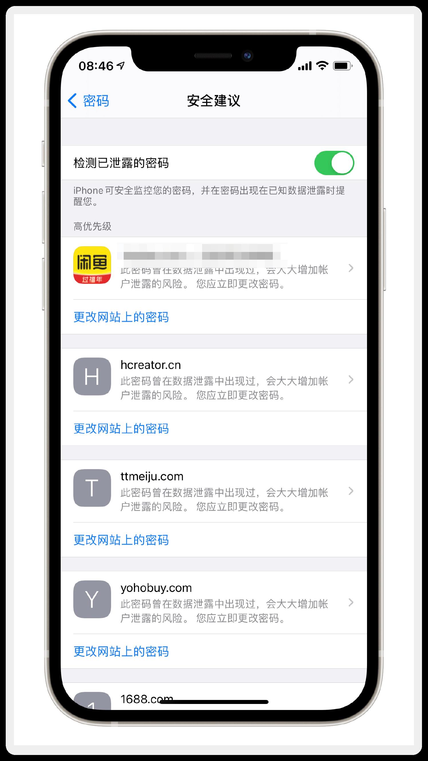 在“设置-密码-安全建议”中,打开“检测已泄露的密码”功能,即可查看自己存储在 iCloud 中的账户密码安全情况。密码泄露、密码太简单、密码重复使用等问题,都会收到提醒,大家可以根据提醒酌情修改密码。