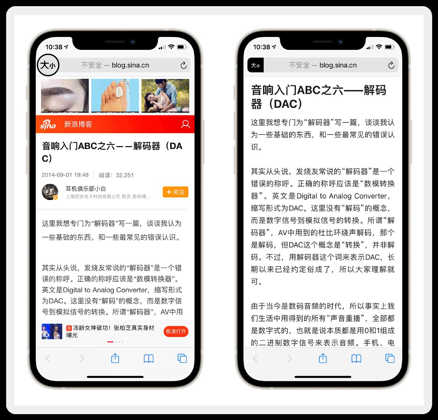 很多新闻 App 为了引导你下载客户端,都会在网页版上添加各种倒胃口的广告。点击 Safari 浏览器左上角的“大小-显示阅读视图”,广告会被去除,图文内容重新排版,还能调整文字大小,体验和看电子书一样。