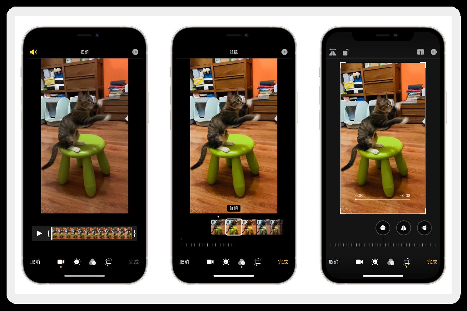iPhone 自带的照片 App 也可以完成一些简单的视频编辑,包括截取片段、增加滤镜、裁切画面等,与图片编辑逻辑完全相同,且同样会记录全部的修改过程,可以一键还原为原视频。