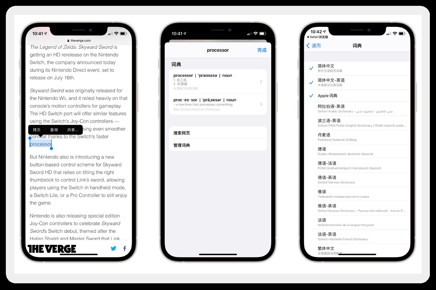 读外文文章碰到生单词,长按选中点击查询,即可调出系统内置词典。