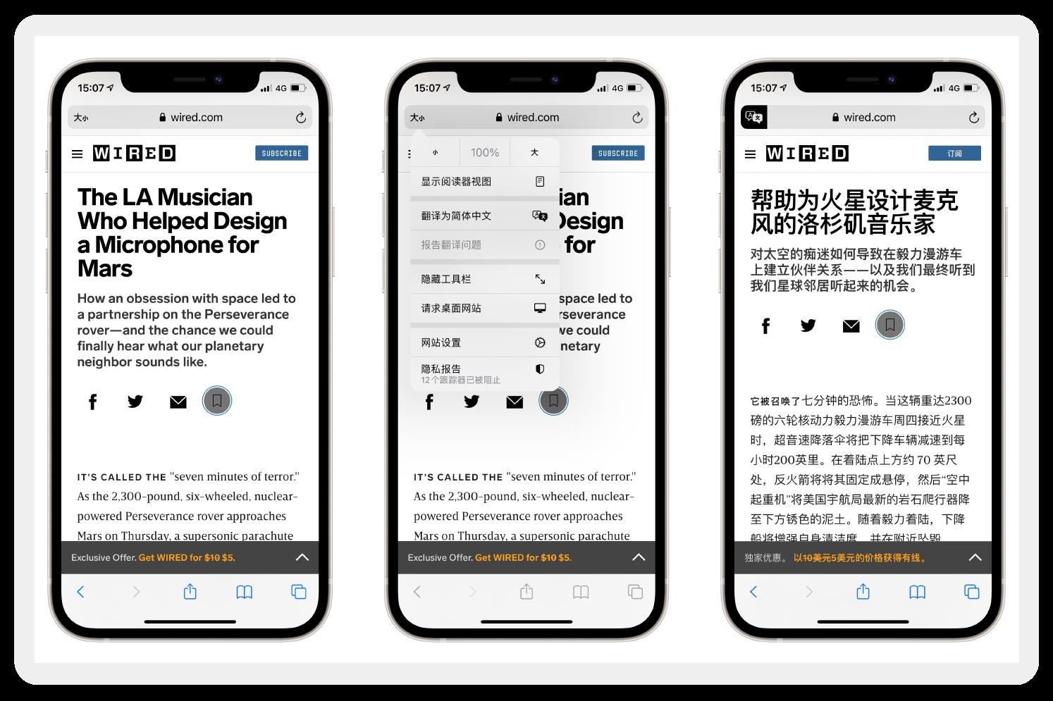 苹果在 iOS 14 中增加了一个翻译 App,它不仅是独立的应用,还内置在了 Safari 中。看外文文章觉得吃力,点击左上角“大小”标识并选择“翻译为中文简体”,即可查看翻译后的中文版。