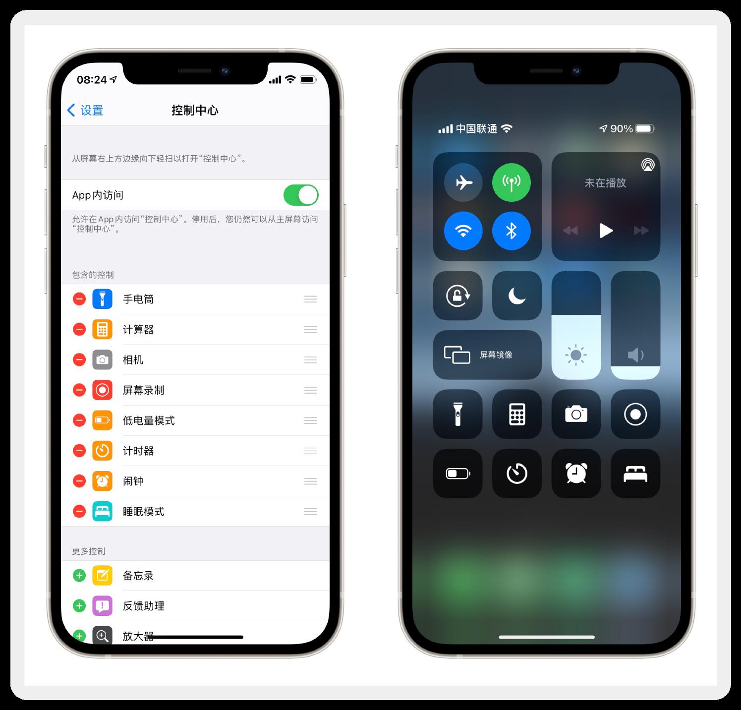 在“设置-控制中心”中,可以选择自己需要的快捷功能并为它们排序。