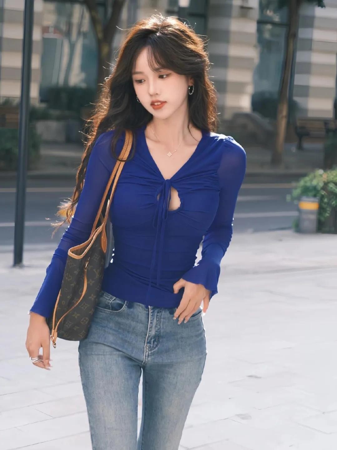 最后一个动作,主打一个“走路随拍”的氛围感。自然地走起来,一只手插兜,另一只手可以随意甩动或者拎个小包,头微微低下来,好像在不经意间被拍到一样。这个姿势超级自然,走路动态感加上手部动作的松弛感,随手拍都是街拍感大片,好看不做作,还能显身材哦!