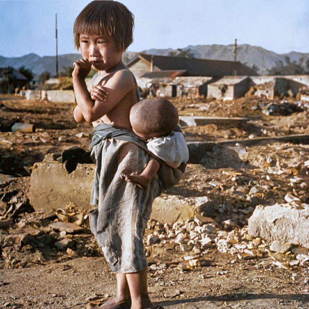 1950 年,朝鲜战争期间,一名孤女和她的弟弟在一座城市的废墟中。