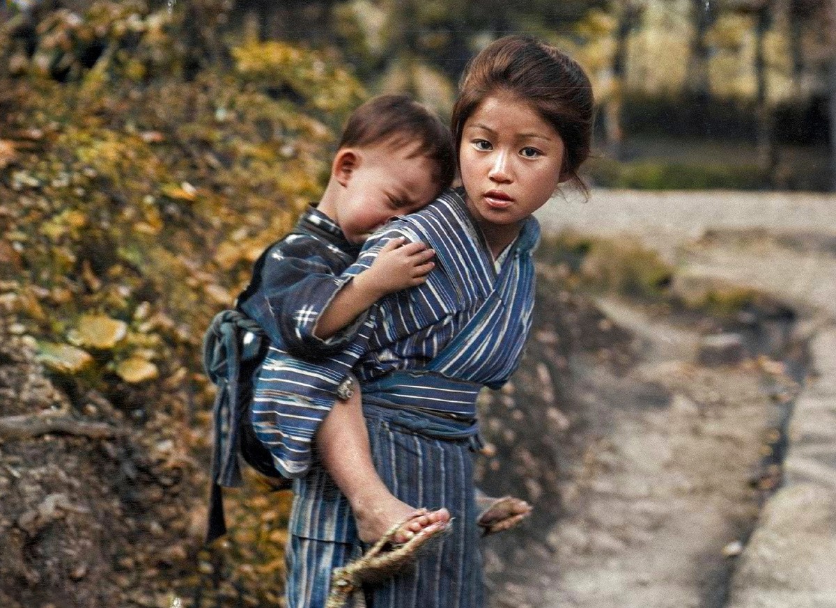 日本女孩背着弟弟。 1908年