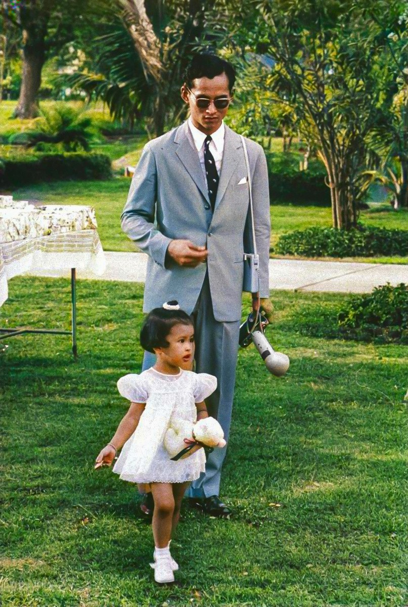 泰国国王普密蓬·阿杜德(拉玛九世)在女儿的生日聚会上。曼谷,1960 年。