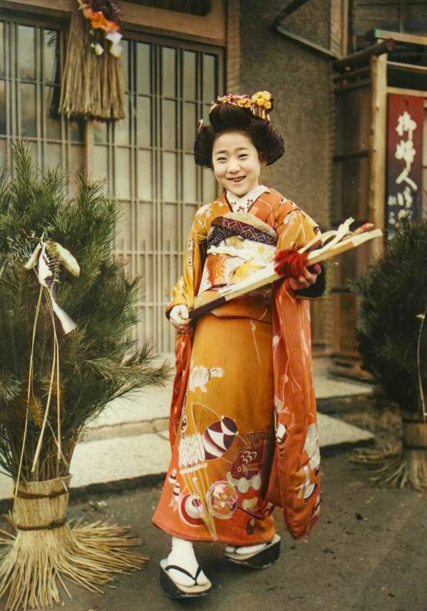 照片中的女孩穿着传统的袜子——“分趾袜”,至今仍然可以买到。特意将拇指分开,方便穿木屐鞋。