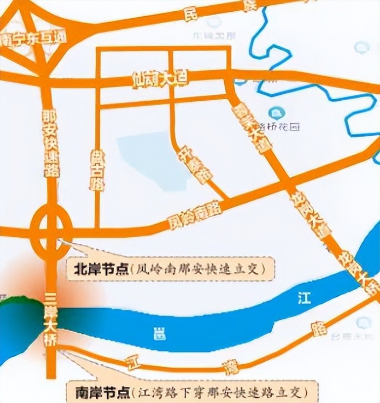 但随着南宁快速发展,对道路也不断地提升,南宁三岸大桥也一下子成为东环快速路的一部分,作为节点工程,已不能满足东环快速路过江的需求了,目前三岸大桥南、北两岸双已实现八车道,而6车道的三岸大桥俨然已成为一个瓶颈路段,时常会出现拥堵,需要扩容。