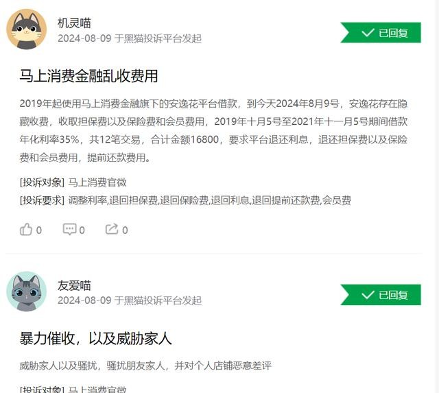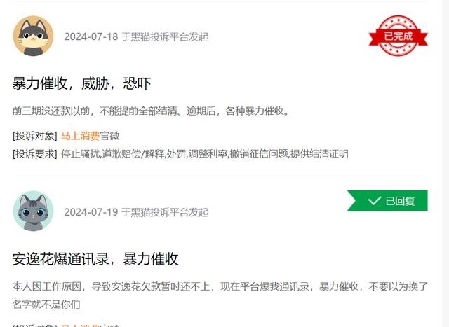 马上消费金融的“安逸花”产品在黑猫投诉平台上收到了大量投诉,其中涉及的问题主要包括暴力催收和乱收费用。消费者反映,他们在逾期后遭遇了频繁的电话骚扰,甚至催收人员还会联系紧急联系人,以及威胁要爆通讯录,严重影响了消费者及其家人的正常生活。此外,有消费者投诉称,在安逸花平台上的借款利率过高,有的年利率甚至高达36%,远超过一般银行贷款利率。