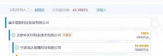值得注意的是,重庆信盟科技发展有限公司背后的股东与马上消费金融的董事长赵国庆有所关联。赵国庆不仅是信盟科技全资股东北京中关村科金技术有限公司的法人,同时也是宁波高达致晟科技有限公司的大股东,而宁波高达致晟科技公司持有中关村科金的多数股份。