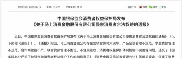 此外,银保监会消费者权益保护局也曾对马上消费金融存在的问题进行了通报,指出其存在营销宣传夸大误导、产品定价管理不规范、学生贷款管理不规范、合作商管理制度不健全、联合贷款管理不规范、催收管理不到位以及消费者权益保护体制机制不完善等七大问题,侵害了消费者的知情权、自主选择权和公平交易权等权益。