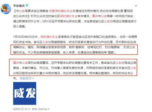 8月1日22时27分讯针对公众关注的渝北区保时捷女车主有关情况,重庆市公安局第一时间进行核实,通过新媒体对外公布;8月1日召开专题会议研究处置,决定责成渝北区公安分局成立调查组进行深入调查。