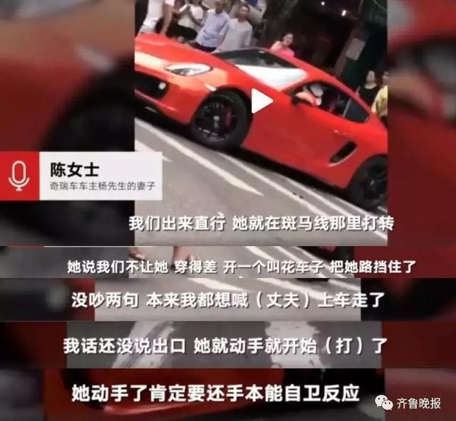 奇瑞车主在车内家人的劝说下,不想跟保时捷女车主过多纠缠,准备上车离开,但是保时捷女车主依然不依不饶,追上去对奇瑞车主进行辱骂,并且突然挥手打了奇瑞车主一个耳光。虽然一再忍让,但奇瑞车主被人在大庭广众之下扇耳光,也是忍无可忍了,猛地回身就回敬了保时捷女车主一记响亮的耳光,将保时捷女车主扇到在车上,保时捷女车主开车时佩戴的遮阳帽也飞了出去。