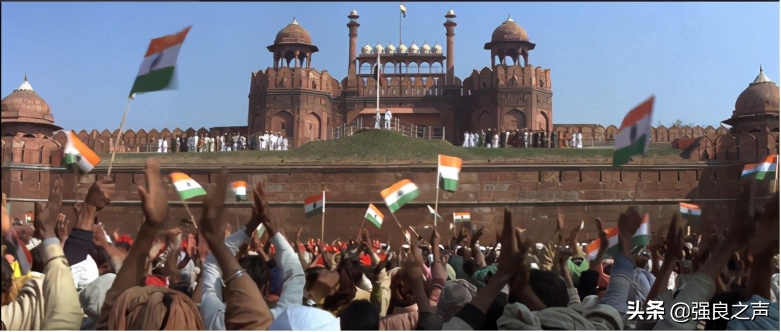 新德里红堡、蒙巴顿和尼赫鲁站在台前,乐队高奏印度国歌,绿、白、桔黄三色印度国旗在旗杆上升起时,成千上万的人齐声欢呼,印度在这一天独立了。