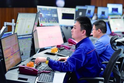 在位于湖南省湘潭市的湘潭钢铁集团有限公司五米宽厚板厂智慧中心,工作人员在远程操作精炼设备。新华社记者 陈泽国摄