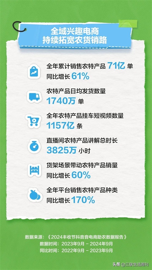 在本次抖音电商丰收嘉年华活动现场,抖音电商鲜食生活行业运营总监翟黎明发布了《2024丰收节抖音电商助农数据报告》。报告显示,2023年9月至2024年9月,抖音电商累计销售农特产品71亿单,同比上一年的总订单量增长了61%,平均每天有1740万单农特产包裹销往全国各地。在商家和达人方面,平台全年农货商家数量同比增长63%,三农创作者数量同比增长52%。