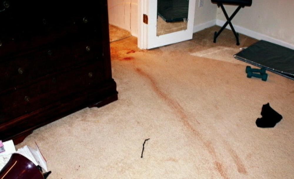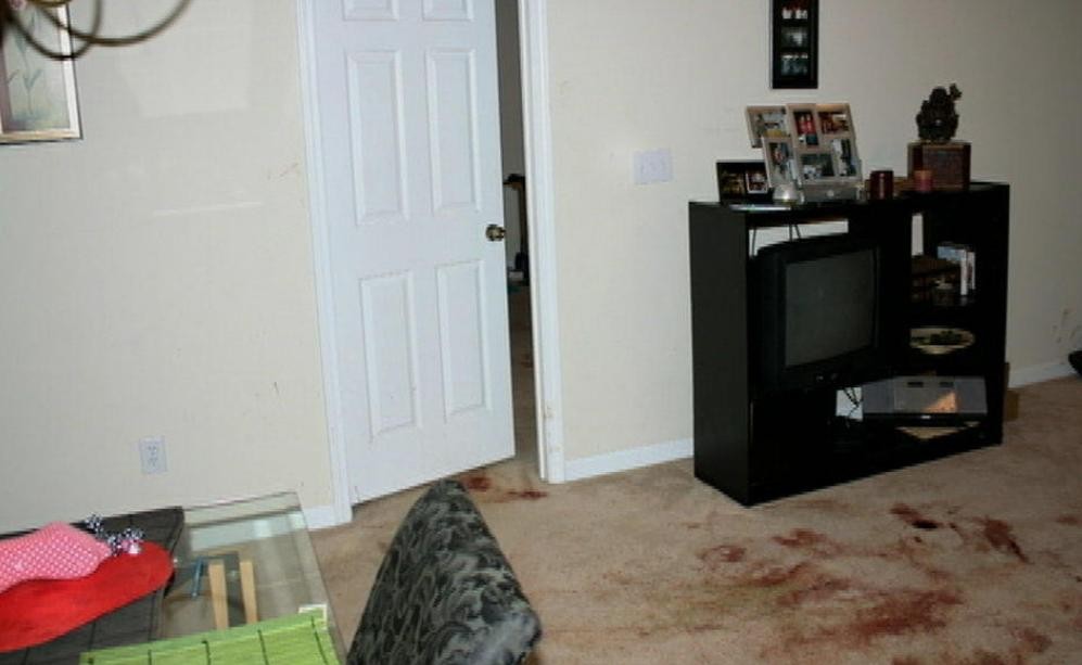 房子客厅到门口的那段距离有一条长长的拖拽形血迹,警方推断尼基曾试图逃脱,但被凶手拖了回去。