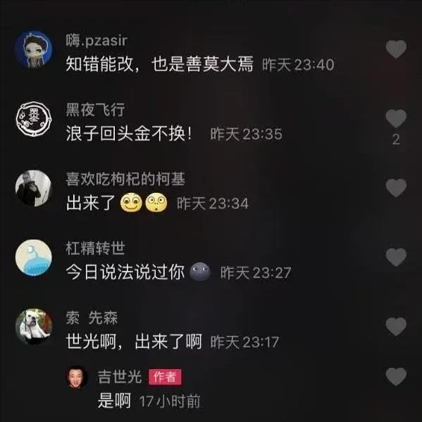 吉世光随即发文回应,称“最近有个视频在说我的事,好多人问是不是我本人。当然是我!我现在只是想弘扬正气,修身立命了,过而能改,善莫大焉”。