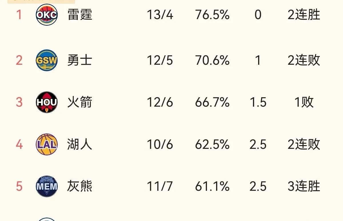 西部排名榜大乱榜首易主,快船丢5;小牛升9平7,熊王归队3连胜