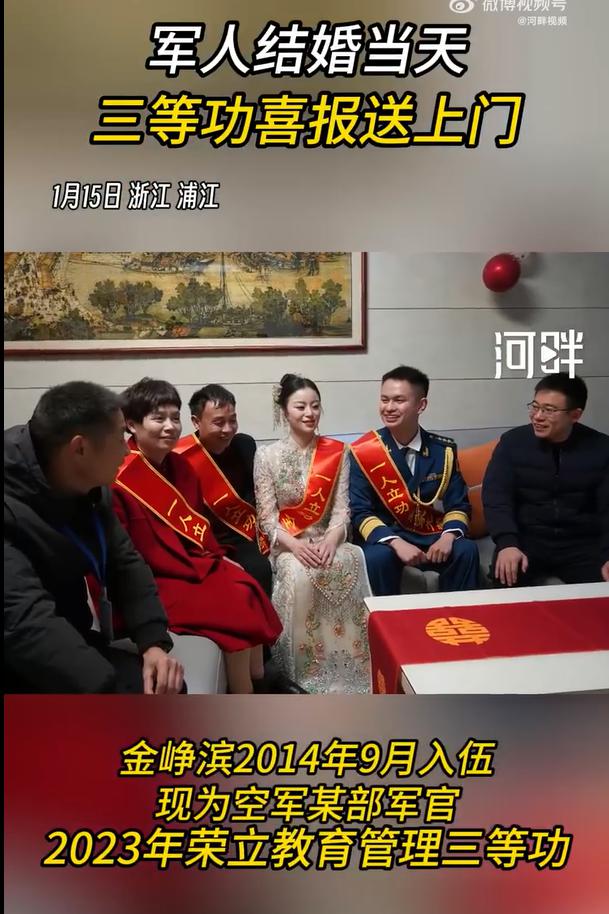 喜报遇上喜事,双喜临门!1 月 15 日,浙江浦江。现役军人金峥滨结婚当天,一大早,郑宅镇的镇、村干部在锣鼓声中给他送去了三等功立功喜报,为热闹的婚礼再添一份喜庆。