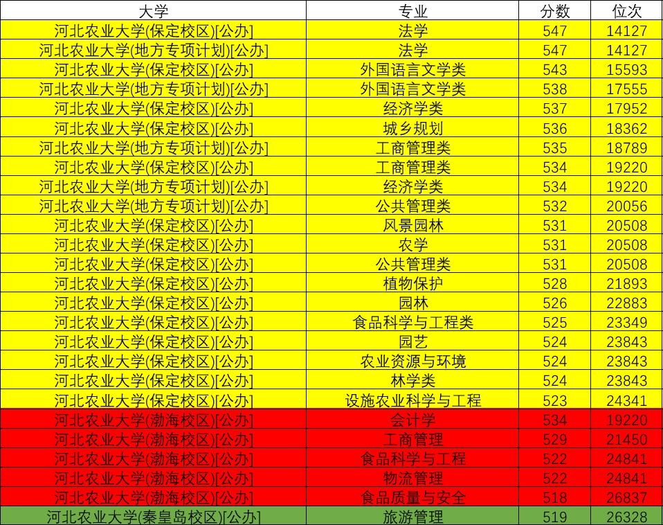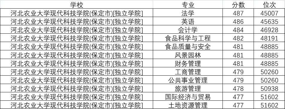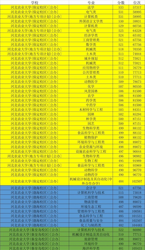 招生计划中,保定校区、渤海校区、秦皇岛校区是三个代码,分开招生,考生以及家长分清楚所报专业位于哪个校区,这都是公办院校专业。千万注意:河北农业大学现代科技学院是独立学院,民办院校,学费物理组合都是10000元,填报志愿时分清楚,千万不要弄混校名,出现高分低报现象。