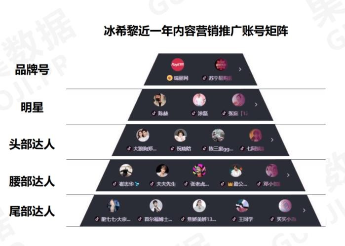 从冰希黎近一年内容营销推广账号矩阵来看,陈赫、大狼狗夫妇、崔中华等明星、头部达人、腰部达人、尾部达人均主要集中在抖音平台。