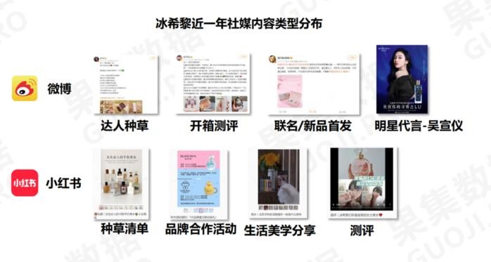 在微博,冰希黎以达人种草、开箱测评、联名/新品首发、明星代言/共创活动等内容类型为主。