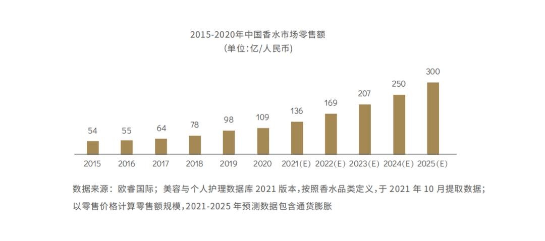 众多数据显示,国产香水品牌正在迎来快速成长期。欧睿数据显示,中国香水市场在2015-2020年间年复合增长率大14.9%,未来5年预计为22.5%,到2025年,中国香水市场零售额达300亿人民币;而全球市场未来5年复合增长率约为7%,2025年将达到4321亿人民币。对比可见,未来几年中国市场的增速将是全球市场的3倍左右,发展潜力巨大。