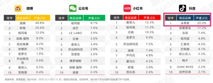 国际品牌在微博、公众号、小红书上的声量更高,冰希黎就常驻抖音。
