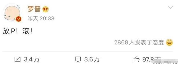 过后不久,罗晋针对疑似出轨传言立即表态否认,口气十分霸气地怒怼了一句:“放P,滚!”