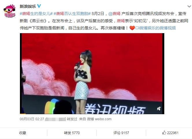 主持人原本要恭喜唐嫣生了双胞胎,哪想到唐嫣现场拆穿谣言称:不是,那是假新闻!