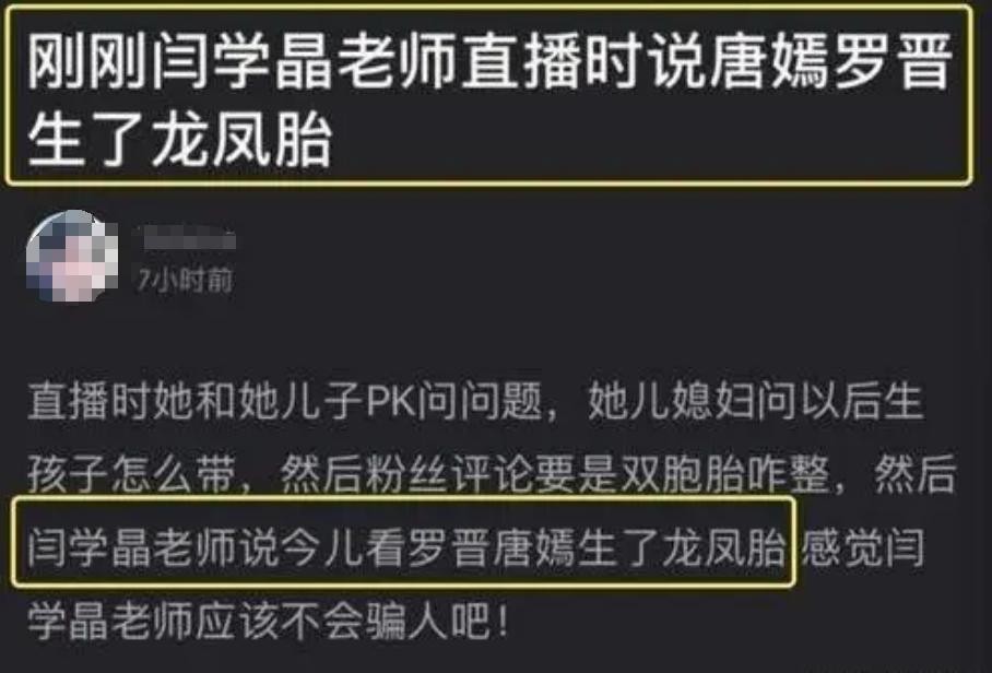 之后在闫学晶的直播中,她透露说唐嫣生了一对龙凤胎,火速在全网传开,不少网友送出祝福,纷纷恭喜罗晋双喜临门。