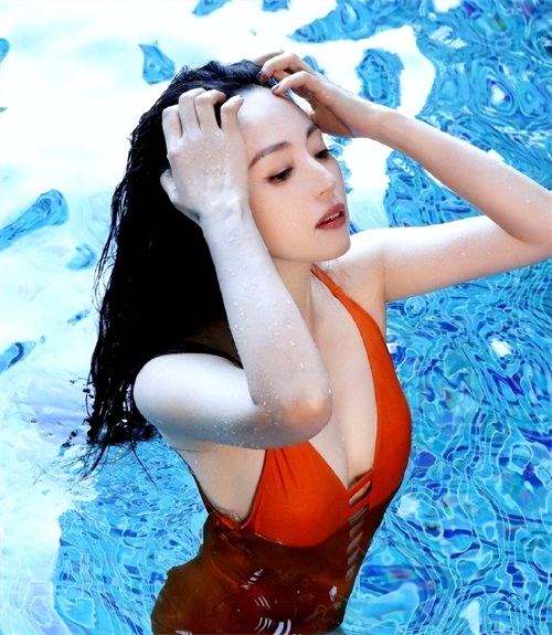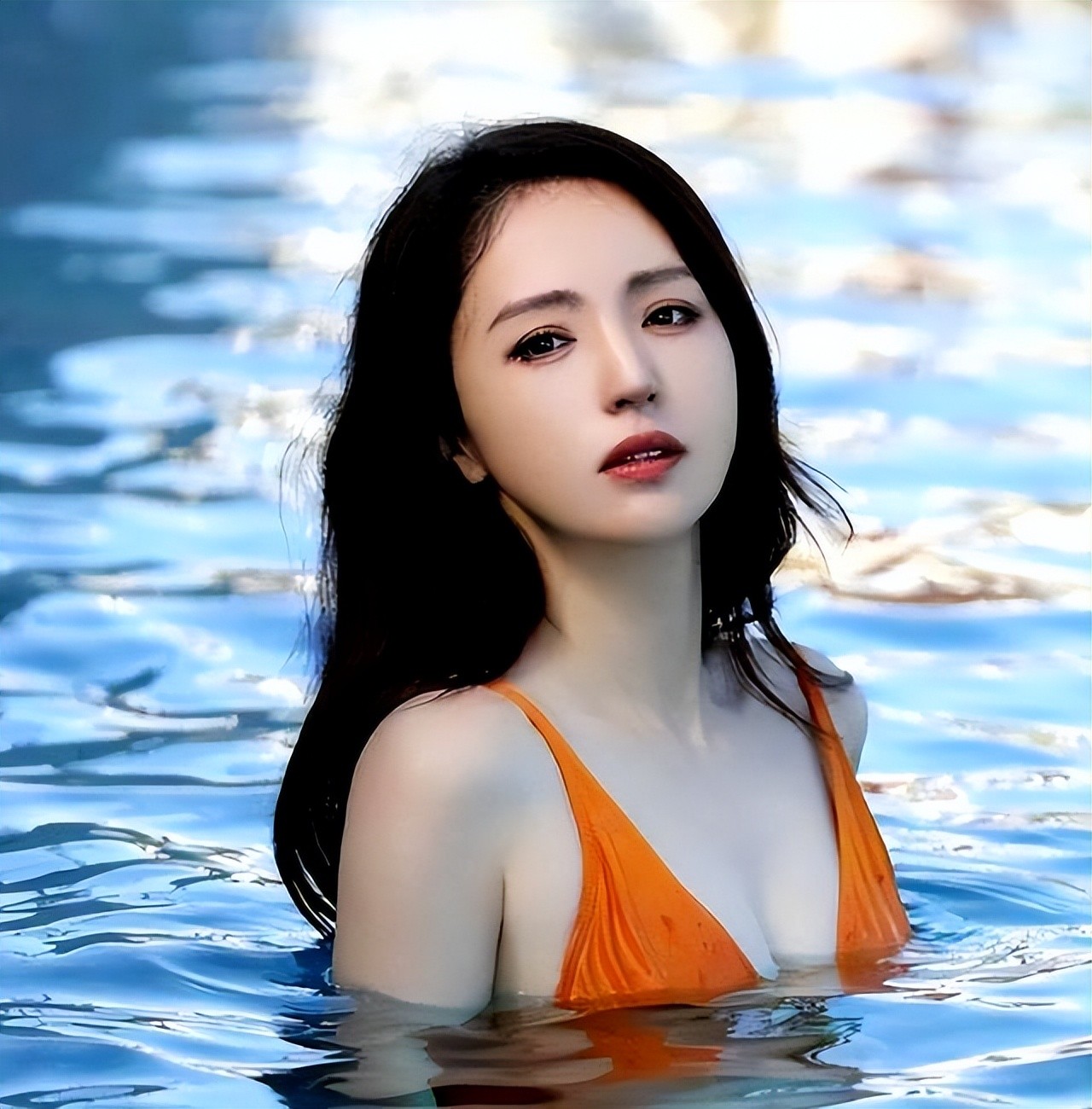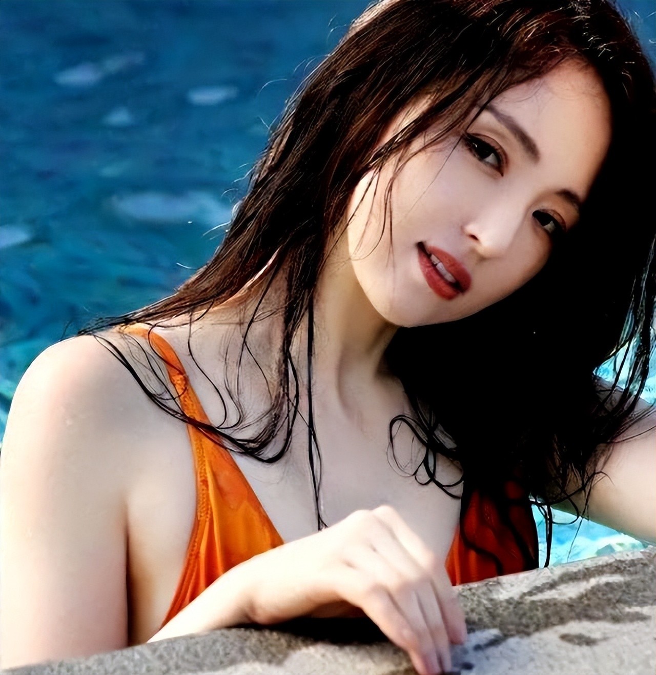 照片中,董璇身着一件橘红色泳装,在水中自如地翩翩起舞。她的每个动作都仿佛蕴含着无限的活力与魅力,那张灿烂迷人的笑脸饱含成熟女性才有的韵味与自信。她就像盛夏的妖娆花朵,吸引着每个人的目光。