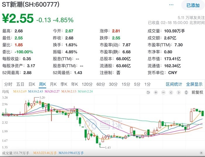 二级市场上,ST新潮的股价在监管函披露后遭遇重挫。2月18日,公司股价下跌4.85%至2.55元,主力资金连续10日净流出,累计达1.26亿元。此前,两次要约收购消息均引发短线炒作,但监管函的披露使得市场情绪迅速降温。