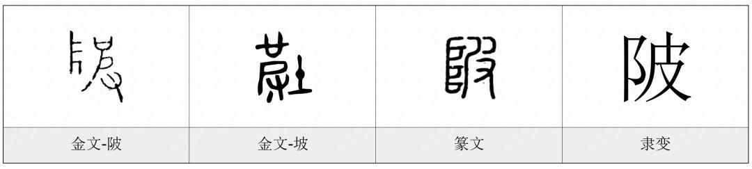 陂【bēi】,金文和篆文的字形是以阜和皮组成的形声字。而“坡”是以土和皮组成的形声字。