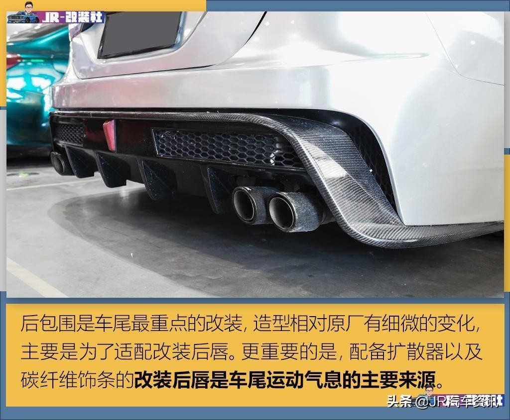 除了前面提到的之外,它还针对外观做了一些装饰性的改装,比如:改用碳纤维纹路的外后视镜盖,加装亮黑色的车尾扰流板,换装款式更动感的后唇等等。