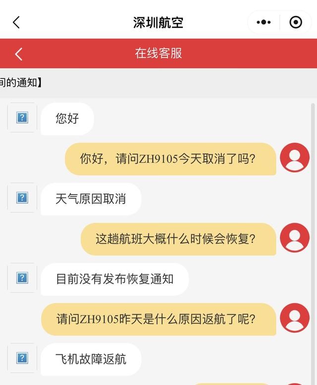 11月3日,ZH9105航班已经取消,读特新闻记者就此咨询了深圳航空在线客服。客服称是“由于天气原因取消”,并且“目前没有发布恢复通知”。而昨日(2日)的返航原因,客服回应是“飞机故障返航”。