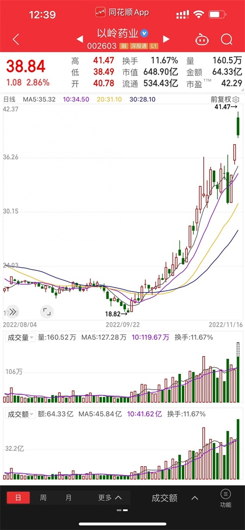 以岭药业公司股票,在短期内的总体涨幅中,已达到股价翻倍。目前股价报38.84元/股,最新市值648.90亿元;流通534.43亿元。在今天的午盘期间,主力、和机构资金方面,净流出资金11.55亿元。成交额为64.33亿元,较前两个交易日相比,有明显放量。作为个人投资股票经验,短期内应提前规避投资风险,切勿盲目追高投资,仅供参考。