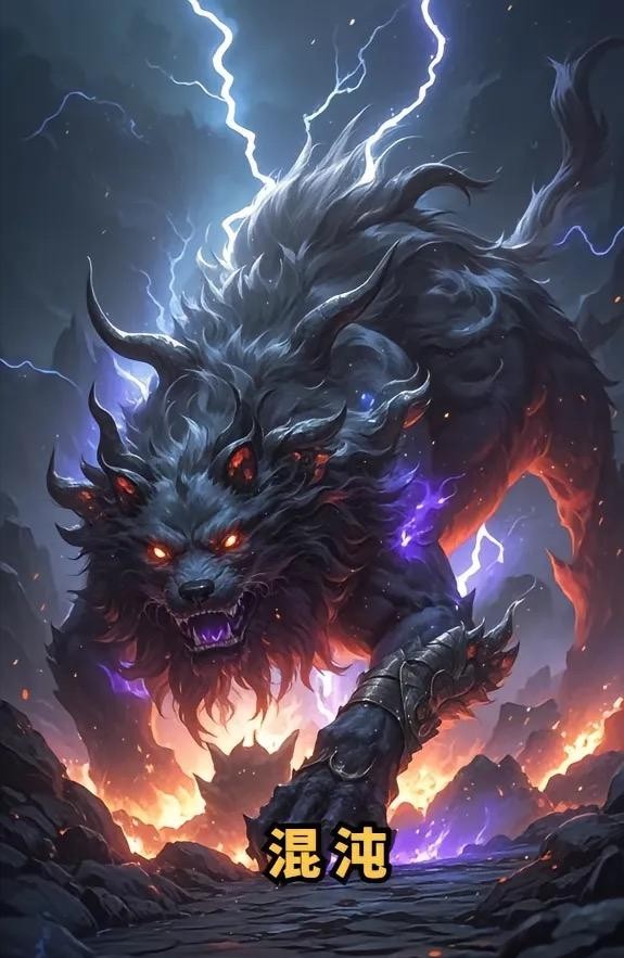 混沌,外貌如同巨大的犬类,全身长毛,四足却无爪,有眼却无法视物,有耳却听不见声音,有腹却无五脏六腑,行动时也无法辨别方向。在《庄子・应帝王》中,南海之帝儵与北海之帝忽为混沌凿七窍,日凿一窍,七日而混沌死,这也侧面体现出混沌的神秘与无序。它的能力在于混淆是非、颠倒黑白,能让周围的环境和生物陷入混乱无序的状态。它偏爱黑暗、混乱之地,对秩序和规则有着天然的抵触,一旦出现,原本有序的世界便会被搅得一团糟,常被视为破坏秩序的代表。