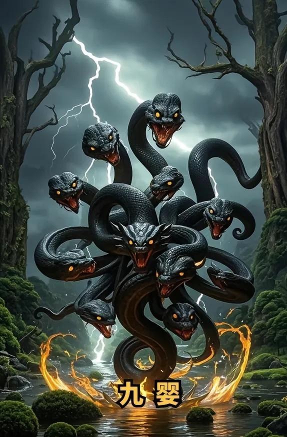 九婴是一种生活在水中的凶兽,有九个头,每个头都能喷出不同的元素,如火焰、洪水等。它的身体巨大,像一条巨蟒,身上有坚硬的鳞片。《淮南子・本经训》提到:“逮至尧之时,十日并出,焦禾稼,杀草木 ,而民无所食。猰貐、凿齿、九婴、大风、封豨、修蛇皆为民害。” 九婴栖息在河流湖泊附近,由于能同时操控多种自然力量,所以经常引发洪水和火灾,危害周边的居民和生物。它食量巨大,需要不断地吞噬水中的生物和岸边的植物来满足自己的需求,是上古时期危害百姓的大患。