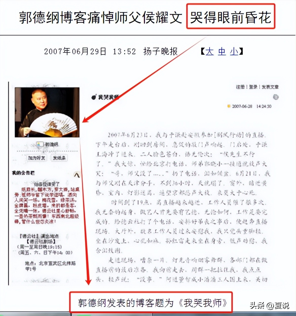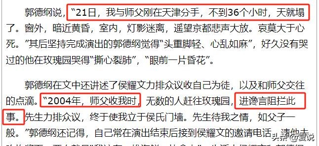 在文中,郭德纲深情地追忆,师父侯耀文待他如亲儿的恩情……