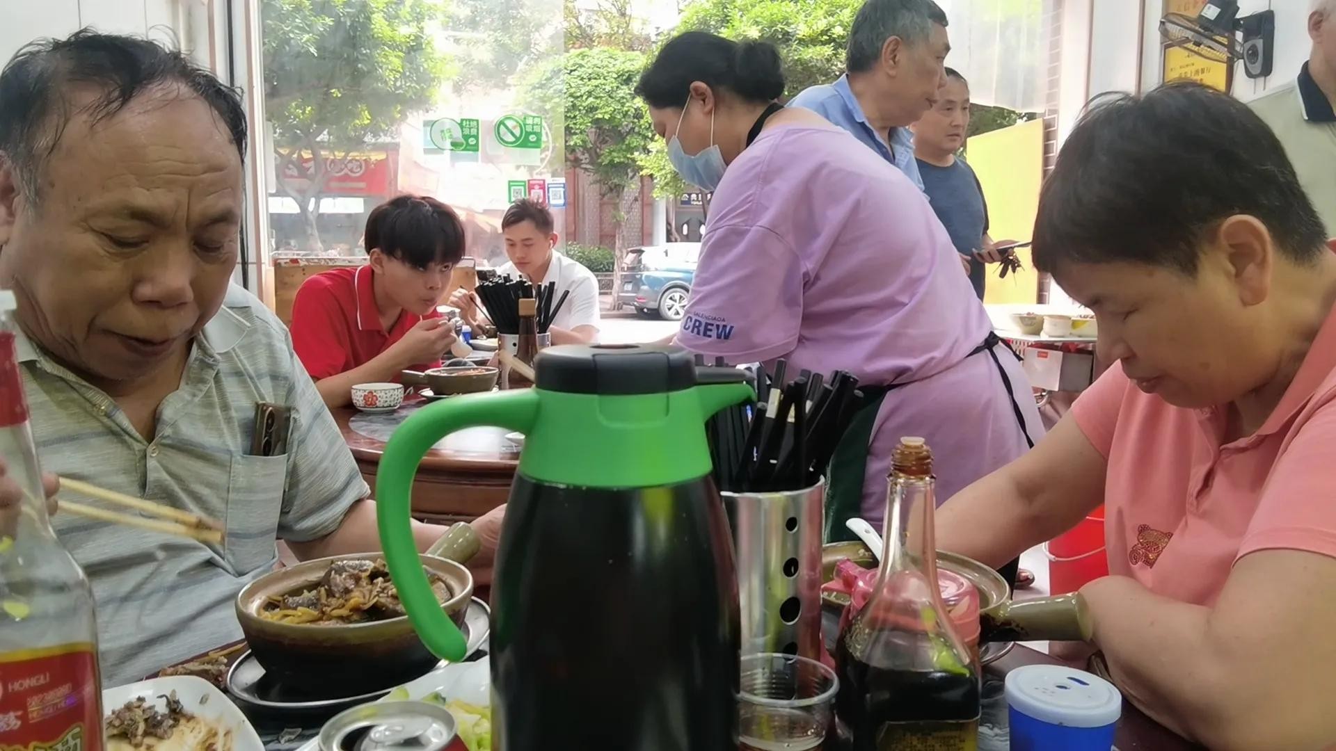 等饭期间,小圆饭桌的对面来了一位60多岁模样的男士,坐下后要了一瓶当地的白酒,可能看我一个人在喝啤酒,他很自然与我攀谈起来,说这个饭店已经有多少年的历史了、哪种煲仔饭特别好吃、这家的汤水可以回碗喝……说话间又来了一位同龄的女士,是他爱人,两个人说了一些家常话。我好奇他那个牌子的白酒,然后闲问了几句,他回答:“我经常喝这个牌子的酒,不贵,但是好喝,喝了几十年了,给你倒点尝尝。”