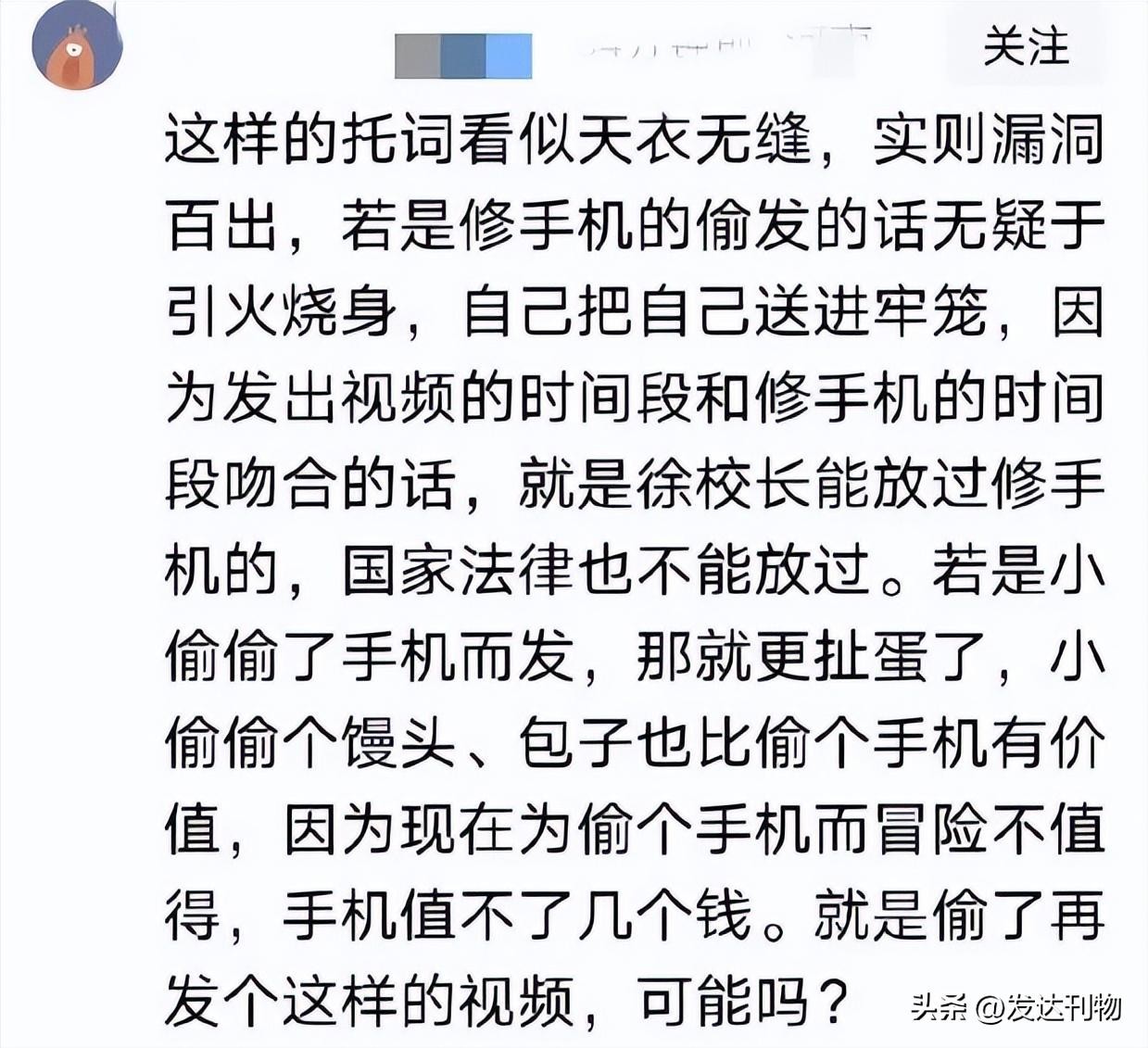 2月25日,徐校长对此事进行了回应,表示她的手机前几天坏了,于是拿去了手机店修理。然而,当她今天乘坐公交车时,又遭遇了小偷的“光顾”,手机再次被盗。这番解释或许是她对于不雅视频泄露的原因进行的解释之一,她坚称这段不雅视频并非自己发送的,但事件的详细情况尚未得到进一步澄清。