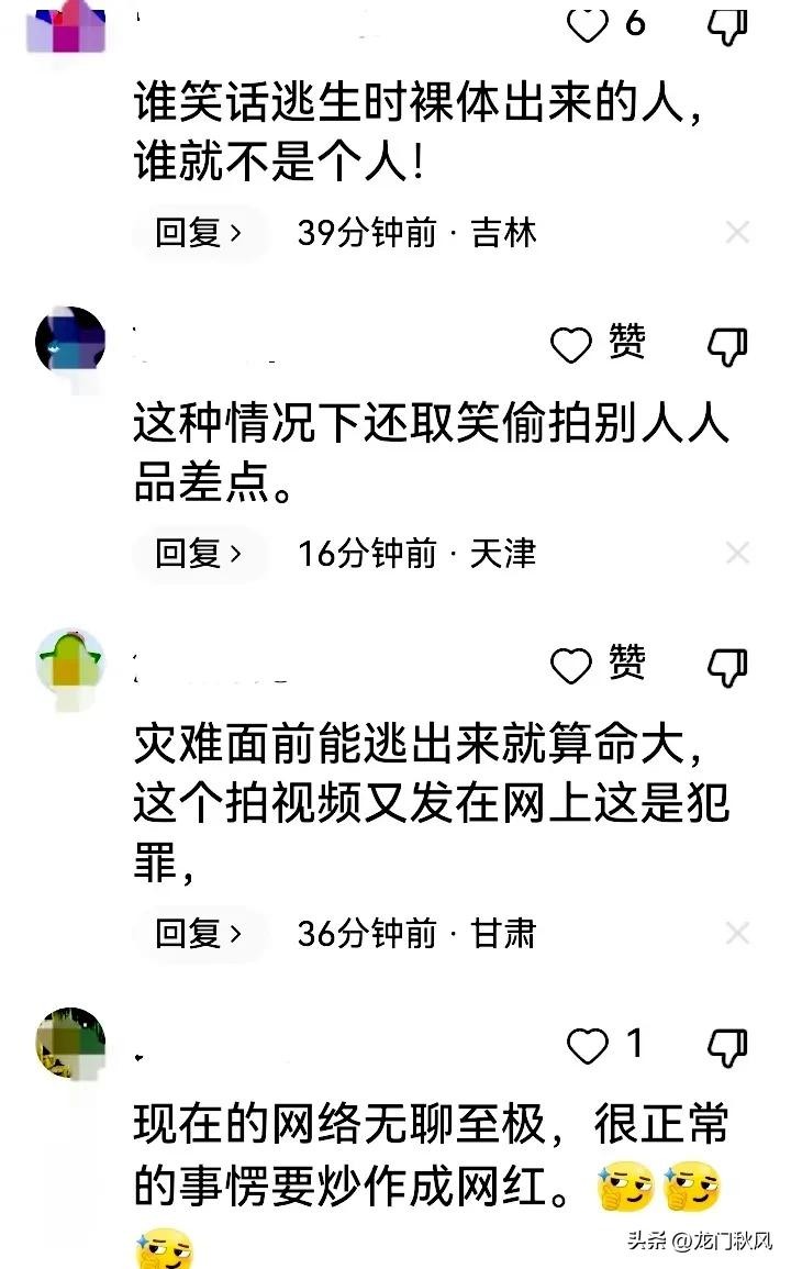在这种生死攸关的紧急时刻,你还有心情拍视频?看到零下十几度的人裸体受冻,把别人的痛苦当笑料?人家为了逃命失去了“体面”已经相当受伤,还要往别人的伤口撒盐?在这种紧张恐惧的氛围中,你是静冷还是冷酷?