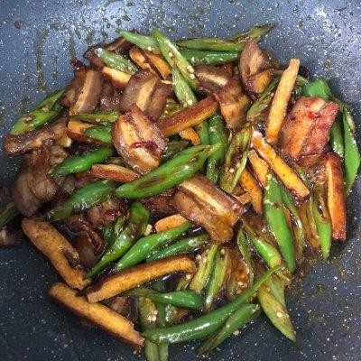 6、搅拌均匀倒入豆干和辣椒