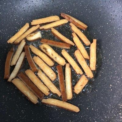 3、锅中放少许油,豆干炸至微焦。